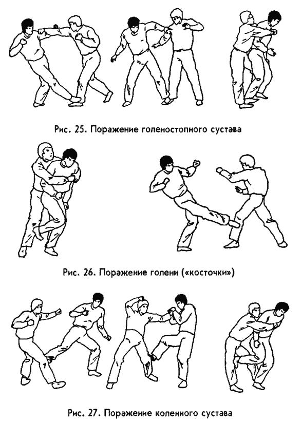 Эти мишени располагаются в порядке, определяемом степенью их доступности. Самая уязвимая часть тела, конечно, голова, но до нее добраться труднее, чем до ног или паха, особенно если противников несколько и они выше ростом (а я беру за основу именно такую ситуацию). Поэтому последовательность выбора целей для атаки является следующей: ноги от ступней до колен, центральная линия корпуса спереди, корпус по бокам, голова, центральная линия корпуса сзади, руки.